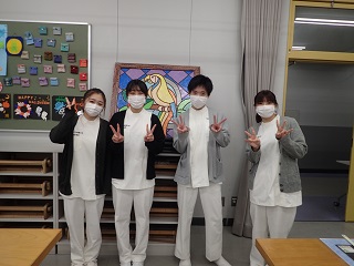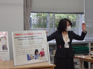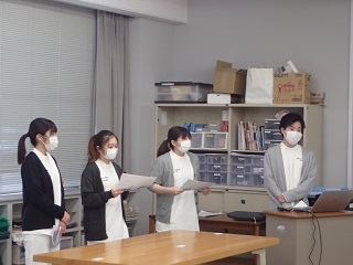 後期授業は対面での授業となっています。4年生は現在、就職活動や国家試験に向けて勉強していることを説明しました。2年生は昨年の解剖学のことについて「骨と筋の構造を学んで、自分の体と比べることでより理解できたこと、おもしろいと感じた」と伝えていました。