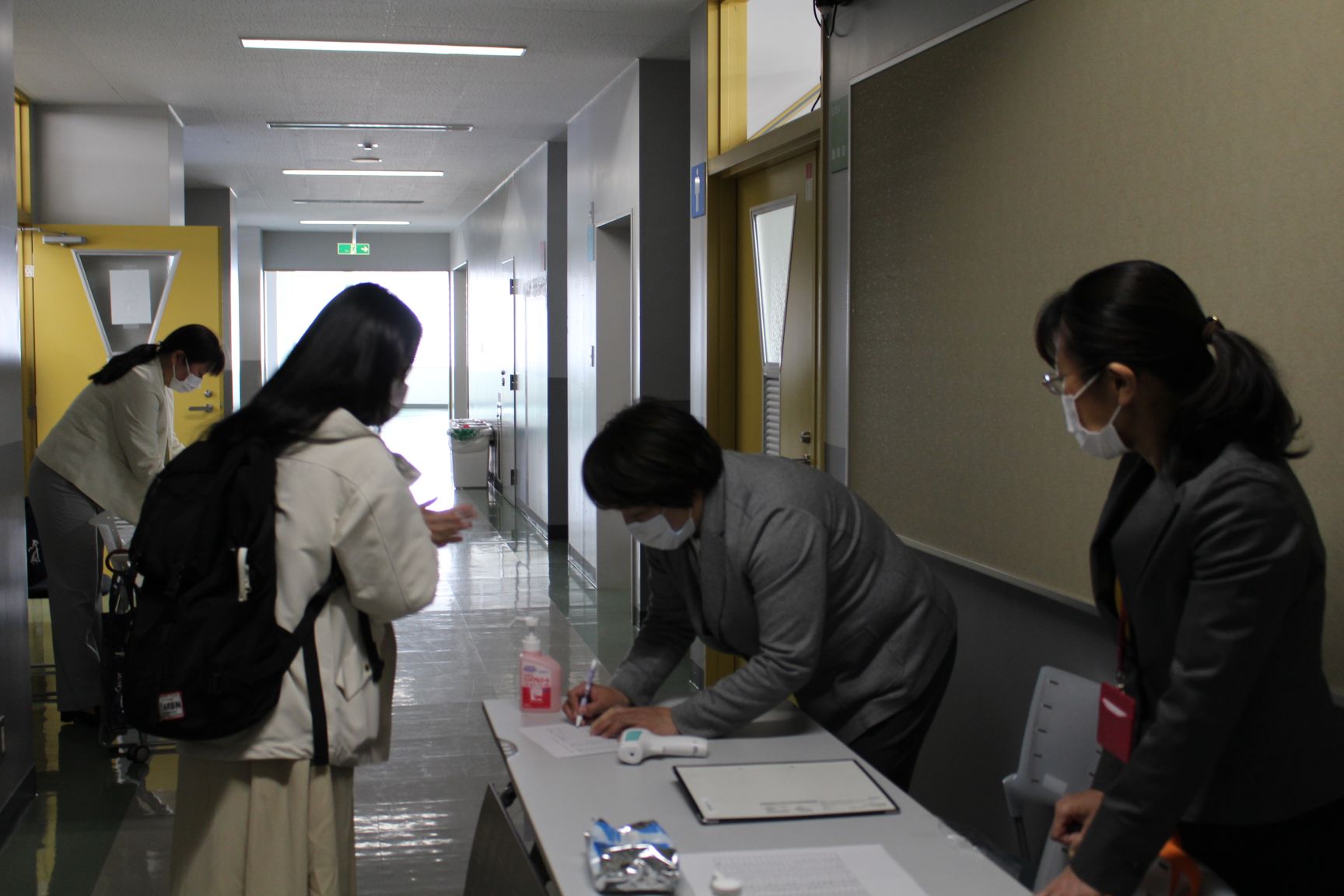 入室の際には、体温測定とアルコールによる手指消毒を行っています。