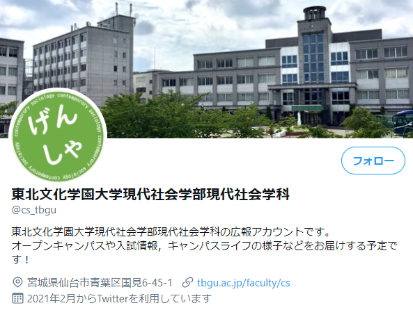 2021.05.07 #社会学専攻 現代社会学部のTwitterが登場 現代社会学部のTwitterが登場げんしゃの先生と学生がつぶやきます。 東北文化学園大学,現代社会学部現代社会学科のURLです。https://twitter.com/cs_tbgu