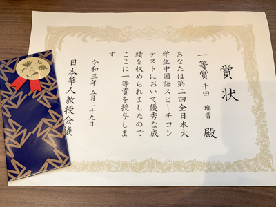 千田瑠音さん、中国語スピーチコンテストで優勝!