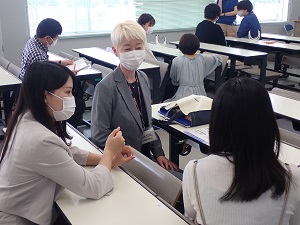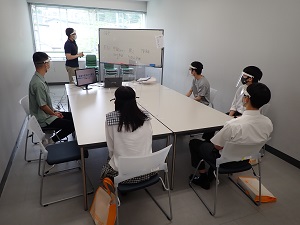 感染予防対策のためフェイスシールドを着用した少人数のゼミ体験やフリートーク、そして保護者相談会など短時間ではありますが学生生活での学びをイメージできるように教員と学生とともに対応させていただきました。