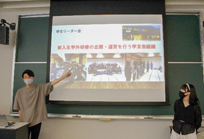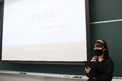 学科説明や入試説明が行われたあと、在学生がリアルな学生生活を紹介しました。経営法学部でできることや「グローカルリーダー育成補助金制度」、さらに学生リーダー会や学園祭実行委員会で体験したことを学生目線で語ってくれました。