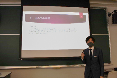 続けて行われた育成ゼミの模擬授業では、淡路智典准教授が男女平等をテーマに講義を行いました。ゼミに参加した高校生たちは、市役所の採用枠の半分を男性、半分を女性にすることへの賛否を選び、自分の意見をレポートにまとめました。