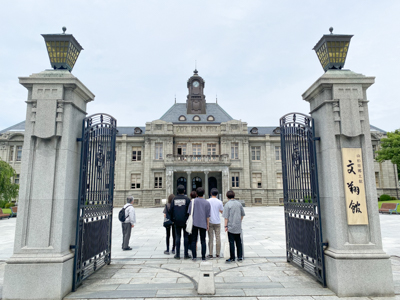 次に山形駅から市営バスで移動し、山形市元町を訪れ、その町並みなどを見て回りました。元町の大通りを抜けた先にある山形県旧県庁舎では、敷地内にある郷土館「文翔館」を見てきました。この建物のつくりは17世紀・英国ルネサンス様式の洋館となっており、中庭を広く設けているのが特徴であり、それにより各部屋に多くの光を取り入れることができる仕組みとなっています。私たちは、この文翔館の見学を通して、戦前や戦中、戦後の周辺地域の様子を知り、昔の城下町がそのまま山形駅周辺の繁華街になっていることを理解しました。