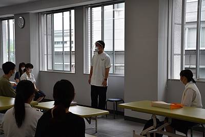 参加者と学生の距離を確保して行い、講義や臨床実習のことなど、学生の目線から本専攻について紹介してくれました。