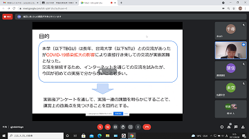当日は、発表する4年生、聴講する3年生もそれぞれ自宅からインターネットで参加しました。大勢が一度にネット会議に参加し、パワーポイントを操作しました�、大きな通信トラブルもなく進行することが出来ました。さすが、遠隔授業の経験を重ねてきた4年生と3年生。ネットを使用したプレゼンテーション能力が高いと感心しました。対面と違って、最初は質問のタイミングがつかめないようでしたが、後半は学生間での熱い質疑応答が繰り広げられました。