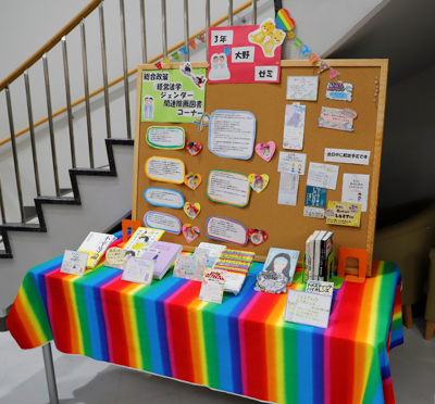 今回の企画のため、ゼミでは1か月半ほどの準備期間で推薦図書を選出し、合評会をしたのち、資料作成、ポップ作成を行いました。今回のコンセプトは「ジェンダー・スタディーズ(特にLGBT)への理解を促進し、差別、偏見のない社会づくりを目ざす」でした。