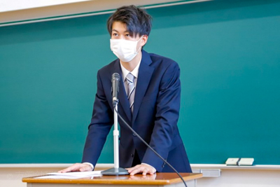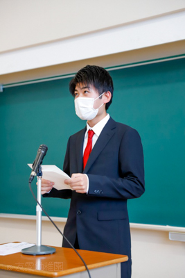 4年生代表の酒井啓輔君による激励の言葉(体験談を踏まえたしなやかな激励の言葉)