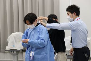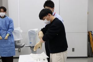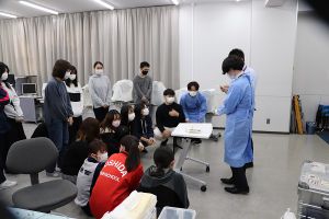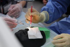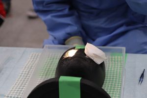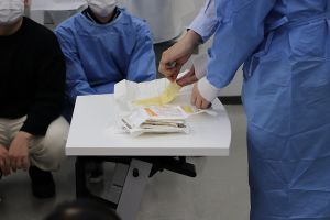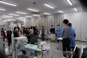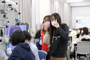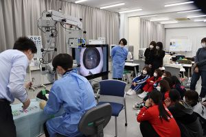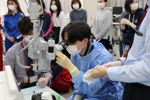 2021年11月30日、1年生の授業「眼科検査基礎演習」の一環「ウェットラボ」において豚眼を用いた眼内レンズ挿入手術体験が行われました。