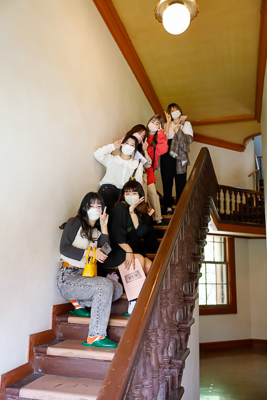 はじめに、同館の学芸員の方に館全体の解説を戴いた後、コロナ禍ということで入場制限が行われていることから、受講生たちはリハビリテーション学科22名と看護学科22名の2グループに分かれての視察となりました。そこで、1グループが館内を視察している間、待機組は指導教官が擬洋風建築の意匠の解説や同館が立地している旧山形城跡内で現在発掘調査が行われている本丸御殿の遺構を見学しながら山形城の解説も行われました。