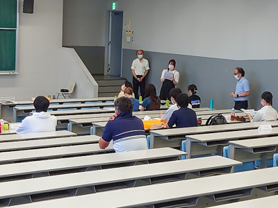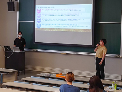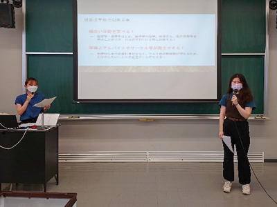今回も学科長の挨拶から始まり、入試説明が行われ、その後、2年生の在学生による学生生活の紹介が行われました。ゼミなどの大学での活動の経験をもとに、参加した高校生達へ楽しく学生生活についてお話しました。