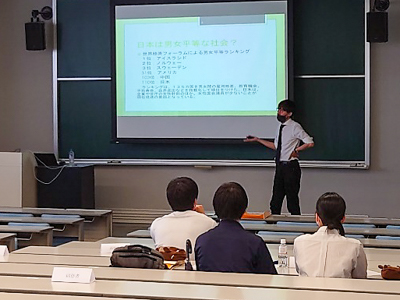 後半には、学科の特色の説明に続いて、淡路智典准教授による模擬授業(育成ゼミ)が行われました。「日本は男女平等な社会?―憲法 14 条から考える―」という題名で講義が行われ、その後、参加者でグループを作り、市役所の採用人数の半分を男性枠に半分を女性枠にするという架空の提案について議論しました。各グループで活発な議論が行われ、一つの結論にまとまったグループもあれば、意見の隔たりが大きく賛否が割れてしまったグループもありましたが、充実したやり取りによって人権や平等に関して見識を得ることができたようです。