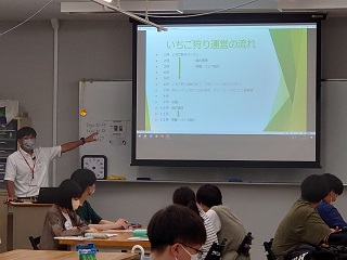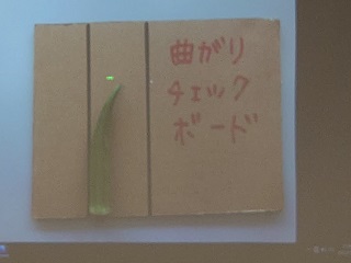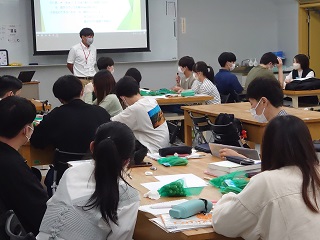 先生が現在、就労支援の作業のひとつとして利用者の方々に行ってもらっているオクラの選別と袋詰め作業を紹介していただき、「どのような工夫をすれば利用者の方の作業がしやすくなるか」というテーマで学生が考え、その発表をしました(先生がオクラを持ってきてくださいました)。