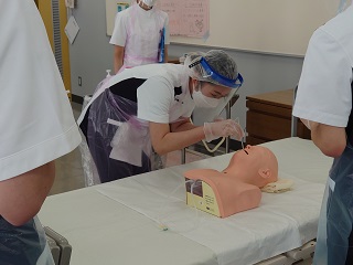 指導を受けた後、ひとり一人の学生が人形を使った喀痰吸引の技術を学びました。