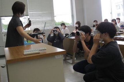 非常勤講師の大塚有希先生(宮城県立こども病院)の講義風景「子どもと家族との関わり方」「多職種連携」です。チャイルドビジョンを使用したアクティビティでは、幼児の目の高さの違いや水平方向の視界が限られているなど、幼児の視界を体験しました。