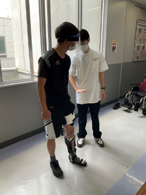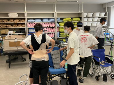 鈴木副専攻長からの専攻説明に続いて、ショートレクチャーは桂助手が担当し、車いす・装具の体験企画を行いました。様々ある車いすや装具の適応を考えたり、その動作指導をしたりすることも理学療法士のシゴトです。
