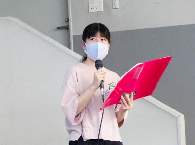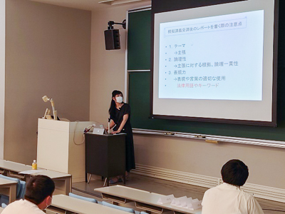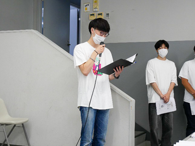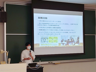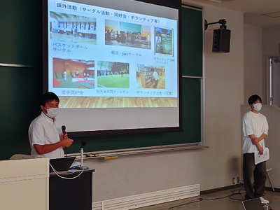 最初に学部長の挨拶及び入試説明が行われ、その後、在学生から学生生活についてお話しました。3年生からは、大学4年間の流れやサークル等の課外活動について紹介し、4年生からは、実経験に基づいたゼミ活動や就職活動についてお話しました。高校生の皆さんは大学生活のイメージを膨らませることが出来たのではないかと思います。