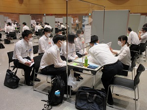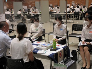 8月9日(火)、仙台駅前のAER4階でPT・OT・ST合同就職説明会が行われました。猛暑の中、30の事業所にご参加頂きました。コロナ感染症が医療・福祉業界に大きな影を落とす中、現場の先生方と直接お話をさせて頂ける形式の就職活動が難しくなっています。それでも本学ではこの3年間、感染対策を徹底することと、密にならない会場設営などの工夫を凝らすことで対面での合同就職説明会を続けてきました。