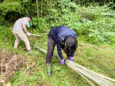 私達が二本松市「針道」集落に通い始めてから5年目になります。今年度は「針道(はりみち)のあばれ山車(だし)」という祭礼を象徴する大型人形の骨組みに使う孟宗竹を伐採・搬出し、制作に参加させていただきました。針道では、里山を利用し、ムラ独自の文化として祭礼を継承する後東若連(うしろひがしわかれん)の知恵や技術を学べました。また、山車を曳き回した祭り本番の臨場感は動画の閲覧からは得難いものでした。祭礼の準備や運営には難しさもありましたが、それも含めて貴重な経験だったのではないかと考えています。
