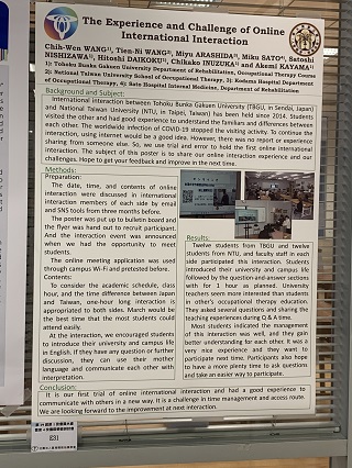 12月初めころ台北で行われた臺灣職能治療*學會国際学会(2022 TOTA Annual Meeting and International Conference)に参加しました.「The Experience and challenge of Online International Interaction」をテーマにポスター発表を行いました.コロナ禍で国際交流が阻まれる中,オンラインで継続する試みの経験と感じた課題を発表し,参加者と活発な意見交換を行いました.台湾の各大学とも日本との国際交流に興味があり,オンライン国際交流の内容や進め方などが聞かれるほか,本学との交流,今後実際の訪問見学等をしたいとの声がありました.今年度は、国際交流の一環として、特別授業を行いました(こちらの記事になります)。