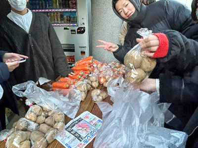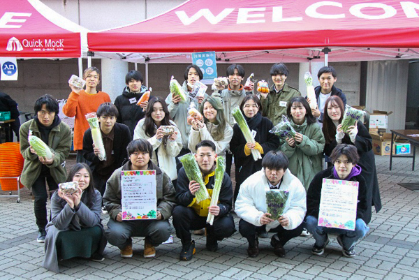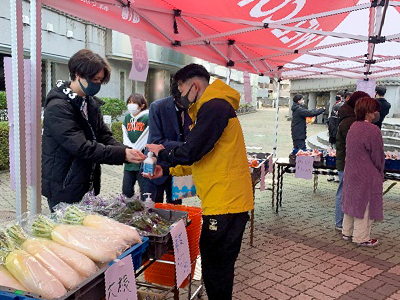 誰も取り残さない組織運営を念頭に、経験者である4年生をアドバイザーとして迎え、仕入れ、広報、設営、会計、リスクマネジメント等の役割分担をし、統括、各班のリーダーを中心に2、3年生20名が一ヶ月という短い期間で準備を進めました。当日は寒い中での販売となりましたが、多くの学生、教職員の方にお越しいただき、仕入れた野菜の9割以上を売り上げることができました。