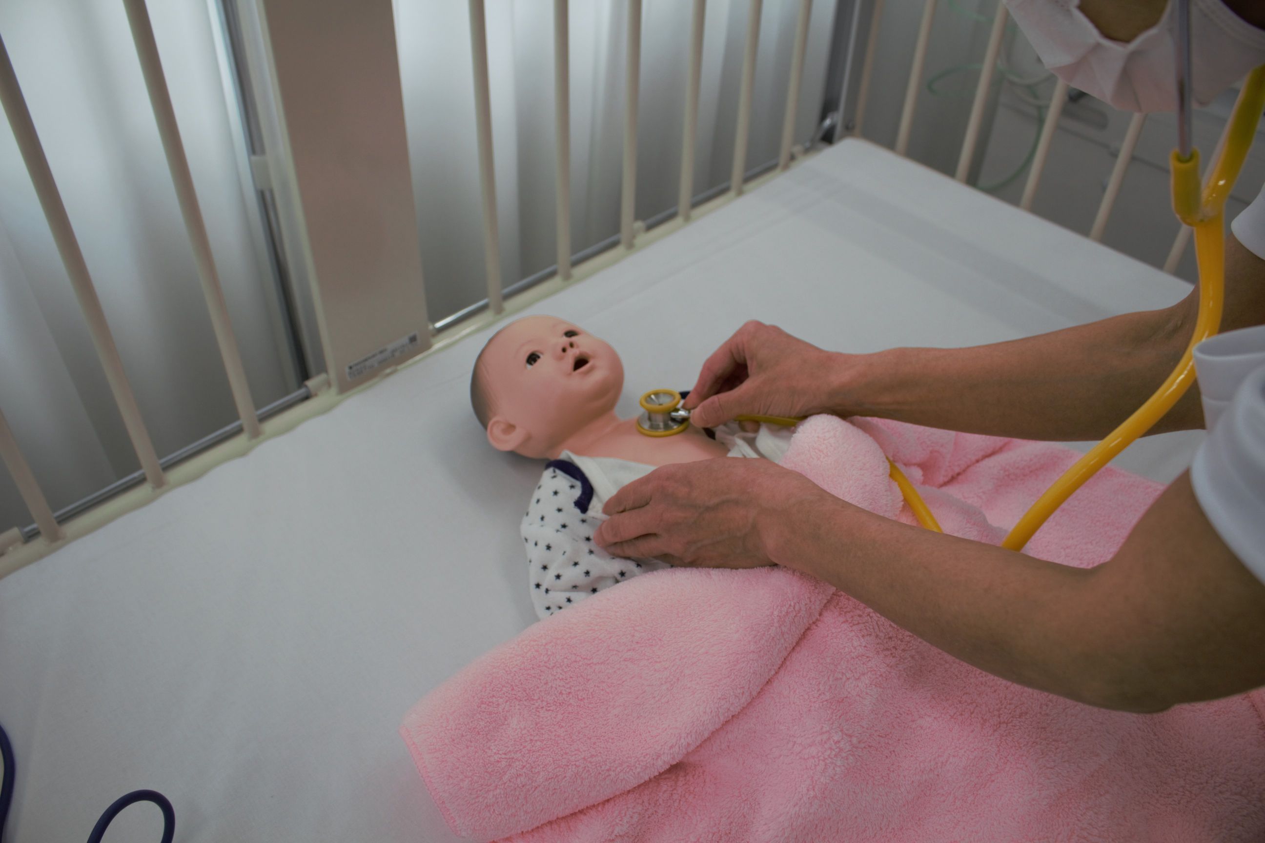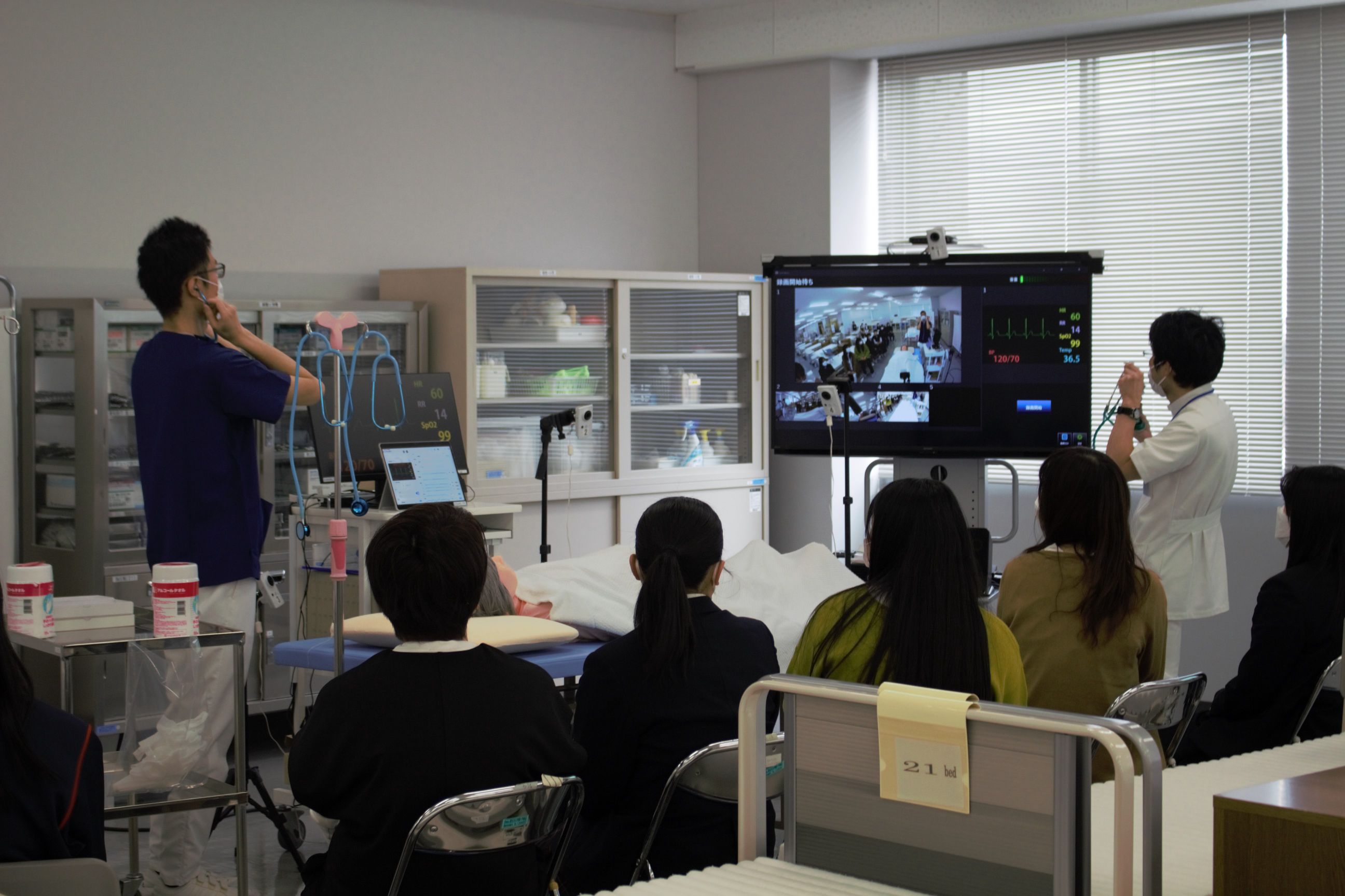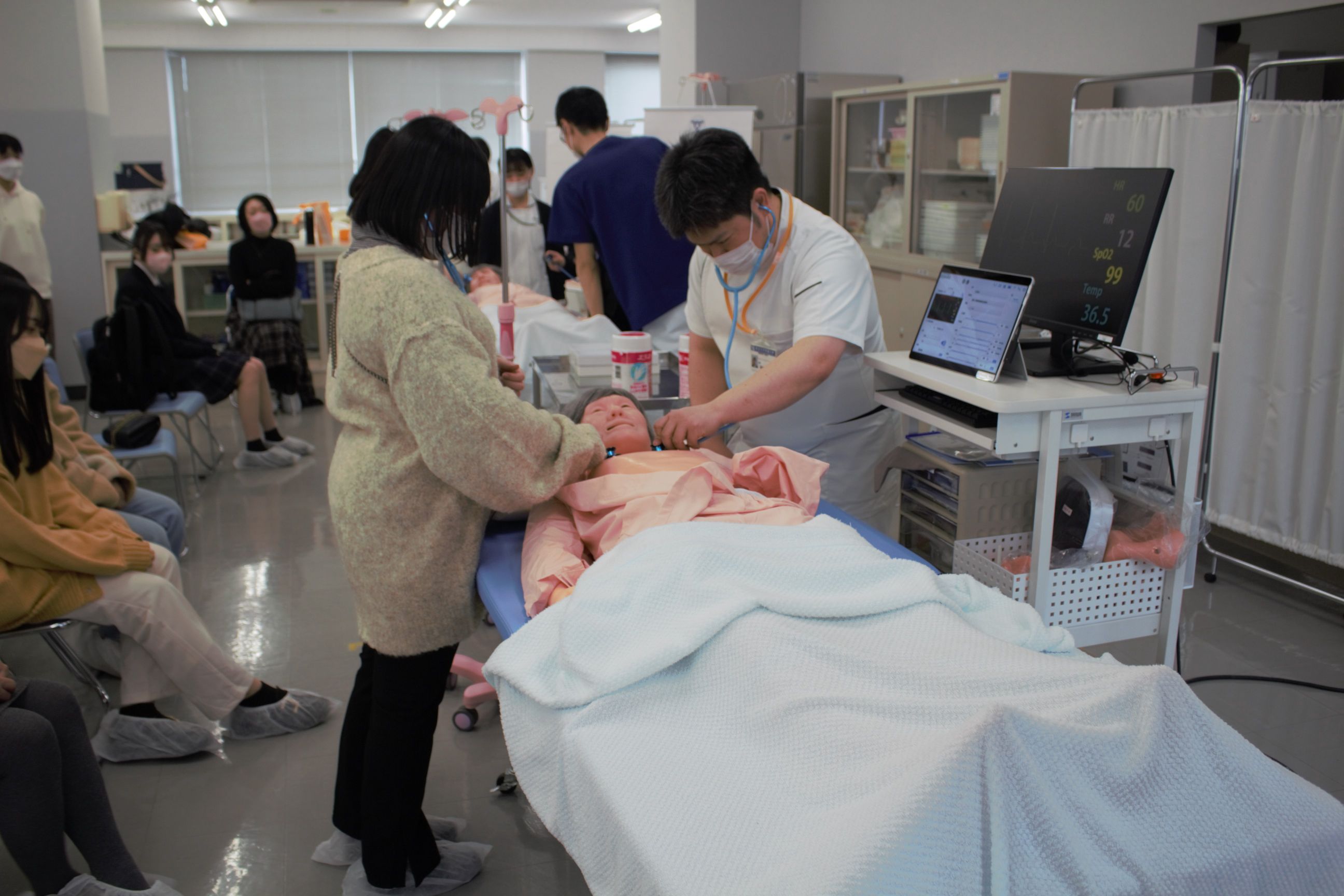 シミュレーターでは病気に応じた呼吸や心臓の音を聞いたり、心電図の波形や顔色等の観察をすることが出来ます。