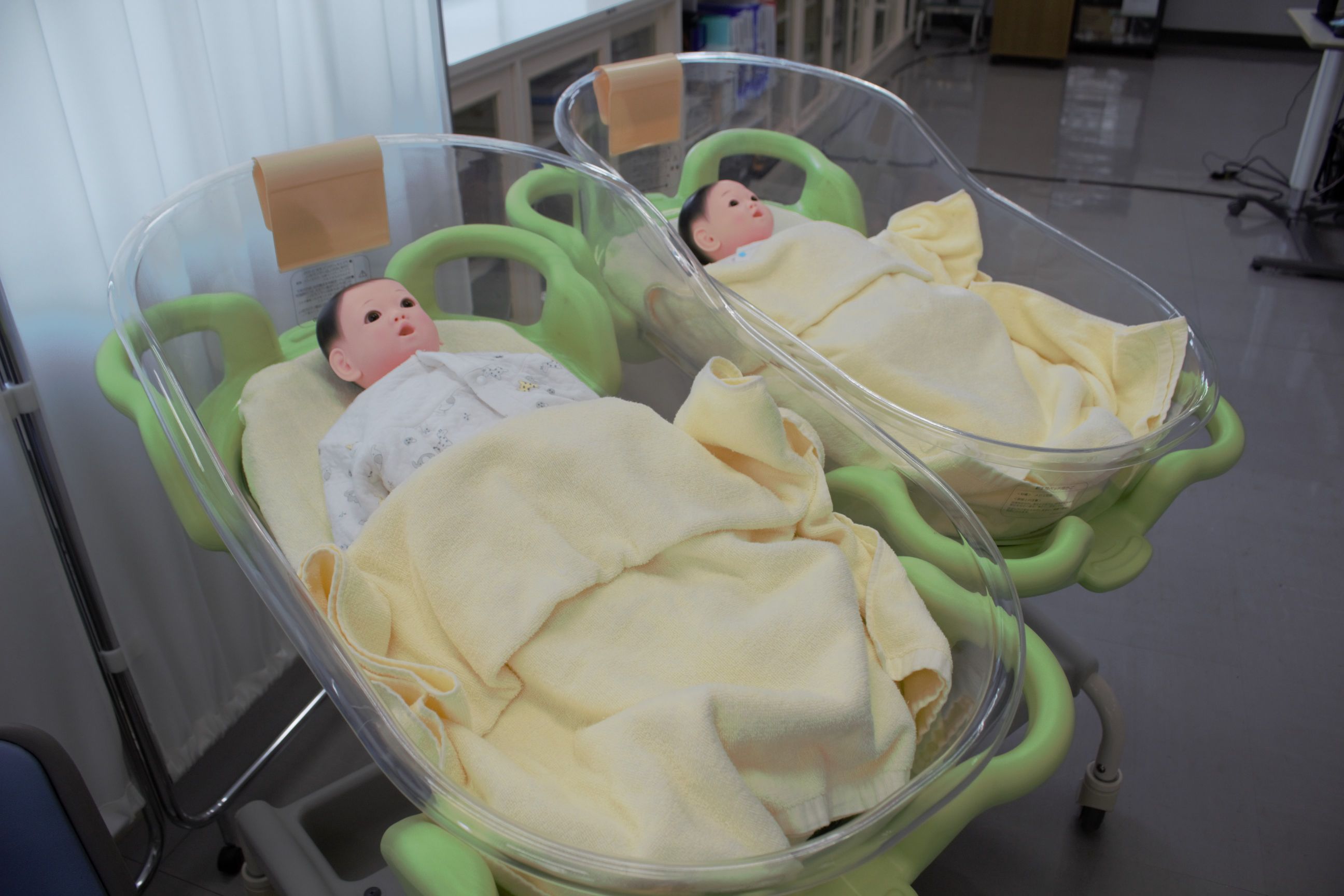 大人のシミュレーターだけでなく、小児もシミュレーターがあります。その他、実際に授業で使用されるモデル人形等を見学していただきました。