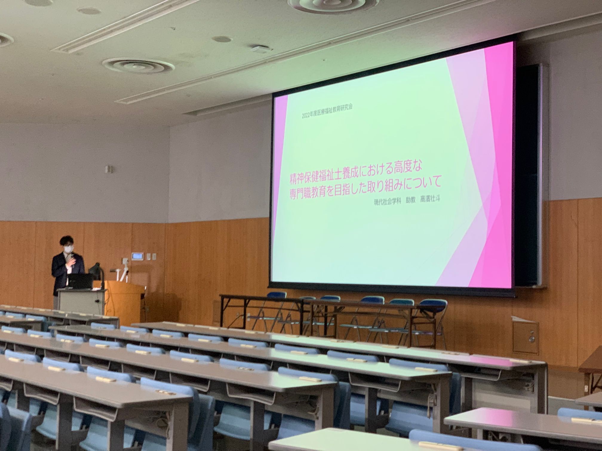 現代社会学部はその前身が医療福祉学部保健福祉学科であることから,本学における精神精神保健福祉士養成について高濱壮斗先生が登壇し説明されました。