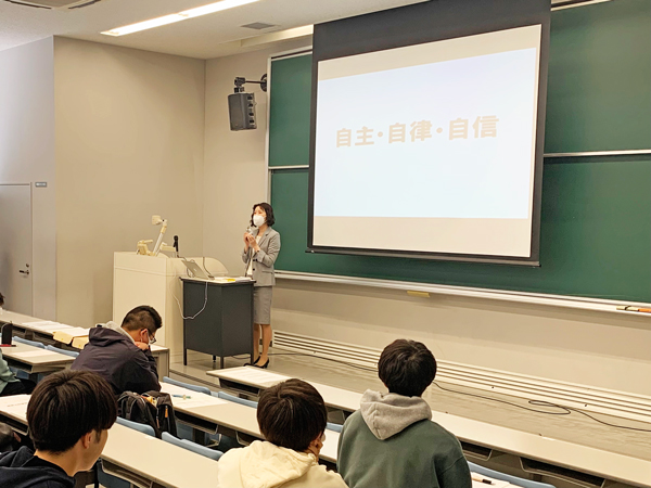 「自主・自律・自信」について説明する沈学科長と聴講する学生