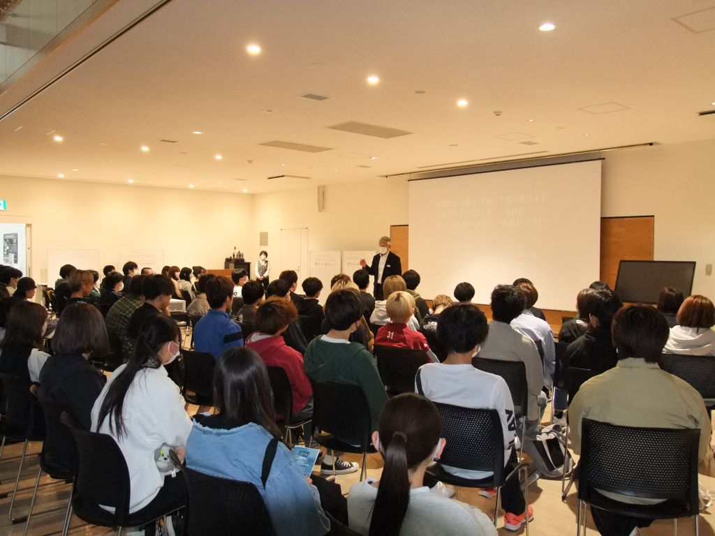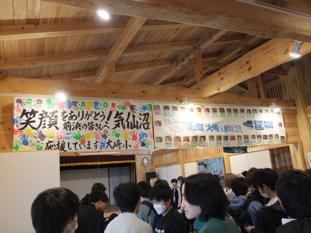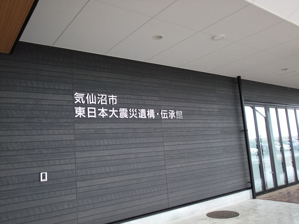 11時に、気仙沼市東日本大震災遺構・伝承館に到着。震災伝承館のホールで説明を受けます。館内は撮影禁止なのですが、今回は館長に特別な許可をいただき、展示物や映像資料が写らないよう、学生の見学の様子を撮影させていただきました。