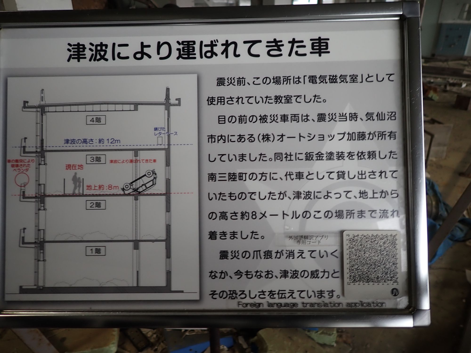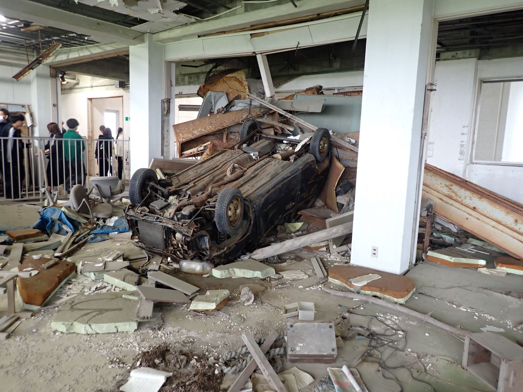 次に、震災遺構を見学します。津波により運ばれてきた車に、津波の凄まじさを思い知らされます。
