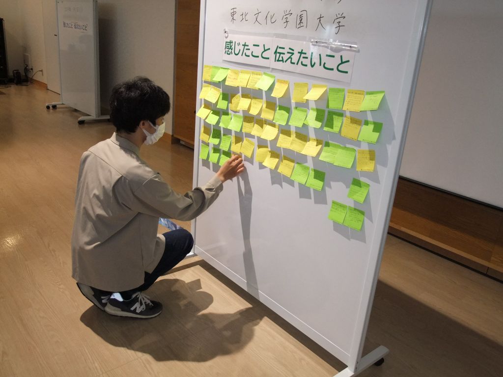 見学後、メッセージボードに貼る付箋に感想を書きます。みなさん、一生懸命書いていますね。