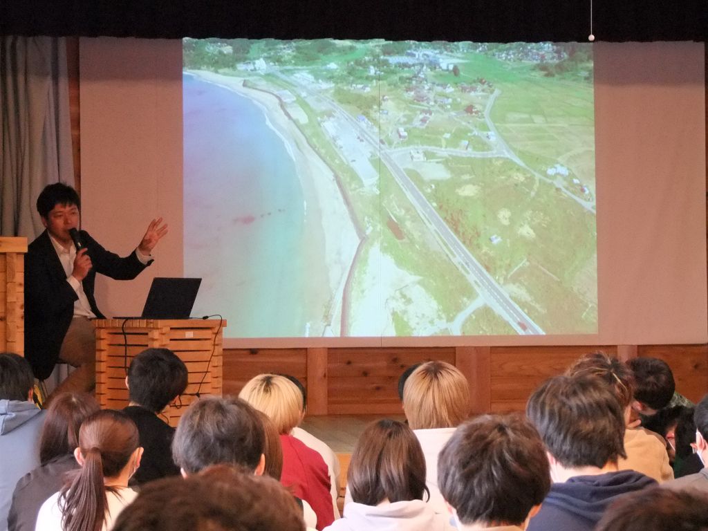 その後、気仙沼市議会議員の三浦友幸さんから震災復興の講話をお聞きしました。みなさん、熱心に聞いていますね。被災者でもあり、防潮堤建設に際し地域住民の合意形成の中核を担った三浦さんのお話を伺って、地域の抱える問題とその解決に向けた活動について、理解を深めることができましたね。