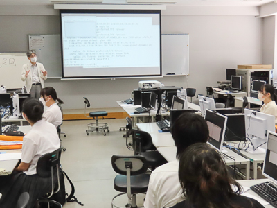 模擬授業は、「ネットのしくみを覗いてみよう」と題して鈴木伸夫教授がネットの便利さと、背中合わせにある危険性について授業を行いました。
