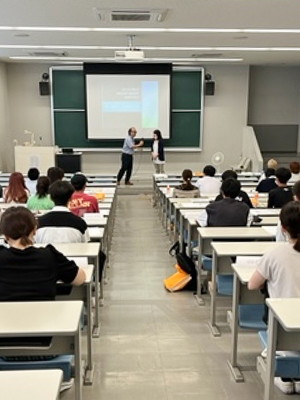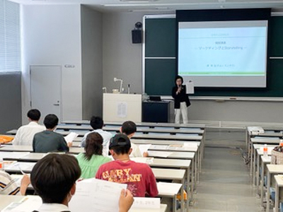 在学生による学部・学科紹介、私の特徴説明に続いて、小休止を挟んで、鄭准教授による模擬講義が行われました。テーマは「マーケティングとstorytelling」で、商品に関する物語を顧客の購買意欲に結びつける最近のマーケティング手法について高校生は熱心に聞き入り、学んでいました。