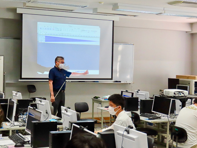 模擬授業は,「コンピュータで音をつくって聴いてみよう」と題しコンピュータ上のオーディオ処理ソフトを用いて音を作成し、人間の音の聴こえを調べることができることを高根昭一教授が説明しました。