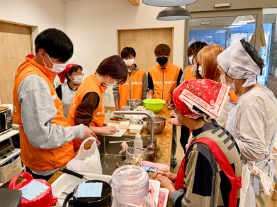 10月6日に3年生6名と2年生1名が同市野蒜ヶ丘にある複合施設「いろどりの丘」を訪問し、現地の方々からご当地芋煮の作り方を教えていただきました。これは12月に当施設と共催で行うクリスマスイベントに向けた取り組みの一環です。
