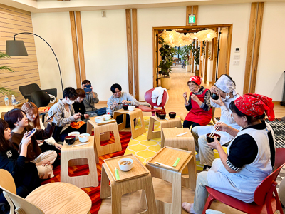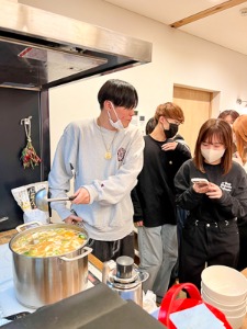 学生たちは経験豊かな年長者に材料の切り方、味付けの仕方などを教わりながら、地元の暮らしの話などを伺いつつ、和やかな雰囲気の中で美味しい芋煮をいただきました。