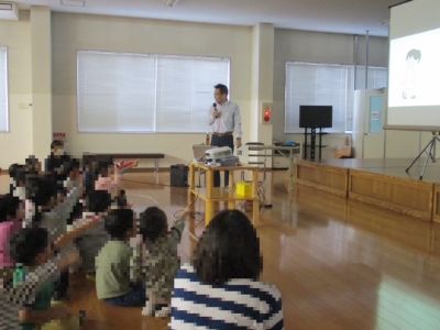 今回は保護者向けのお話だけではなく、講演の冒頭15分程度で久慈幼稚園の園児向けにオリジナルの紙芝居などを用いてお話をしました。