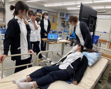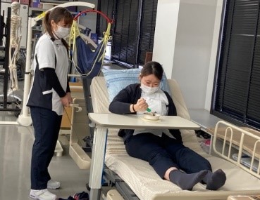 身体障害作業療法学演習は、脳卒中による片麻痺、脊髄損傷、パーキンソン病などの変性疾患などによる機能障害によって日常生活能力が低下した人への支援技術を学びます。11月28日は姿勢について、寝た姿勢、ベッド上で背もたれを挙げた姿勢、車椅子の姿勢について学びました。休息に適した姿勢、食事や手工芸など活動に適した姿勢について考察しました。