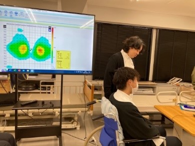 【座圧計を使って、①姿勢による重心の位置や圧力が強くかかる場所②褥瘡予防のマットやクッションの効果も検証しました】