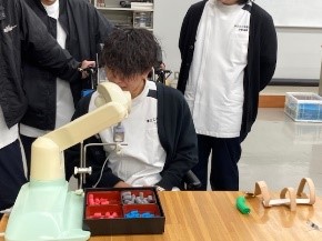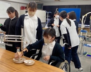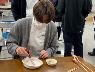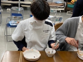 12月5日は食事について学びました。作業療法では、食物に関する認知機能・嗜好、食事に適した姿勢や椅子・机といった環境の調整、運動機能に合わせた食具の工夫、食具操作のための感覚・運動機能訓練のように総合的に食事動作を支援します。この日の授業でも、様々な機能を代償する道具や姿勢による飲み込みにくさを経験し、快適な食事に必要な機能について学びました。単に動作について学ぶだけではなく、障害を模擬体験することで対象者の気持ちを理解することや、科学的な根拠に基づいた支援を学び、臨床で輝ける作業療法士を目指していきます。