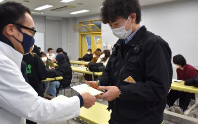 学生達へ「受験票」や「起き上がりだるま(松田工房)」、合格鉛筆を渡しました。
