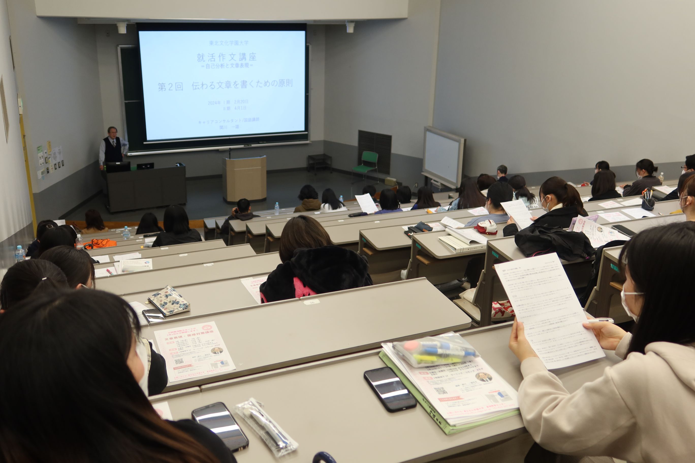 Ⅰ期(1/22、2/20)は看護科の約60名が受講し、自己分析に関する事前ワークと作文課題「志望理由書」に取り組みました。提出した課題について、個別の添削を受けられることが本講座の特徴です。講師からのコメントは就活対策に大いに参考になるようです。