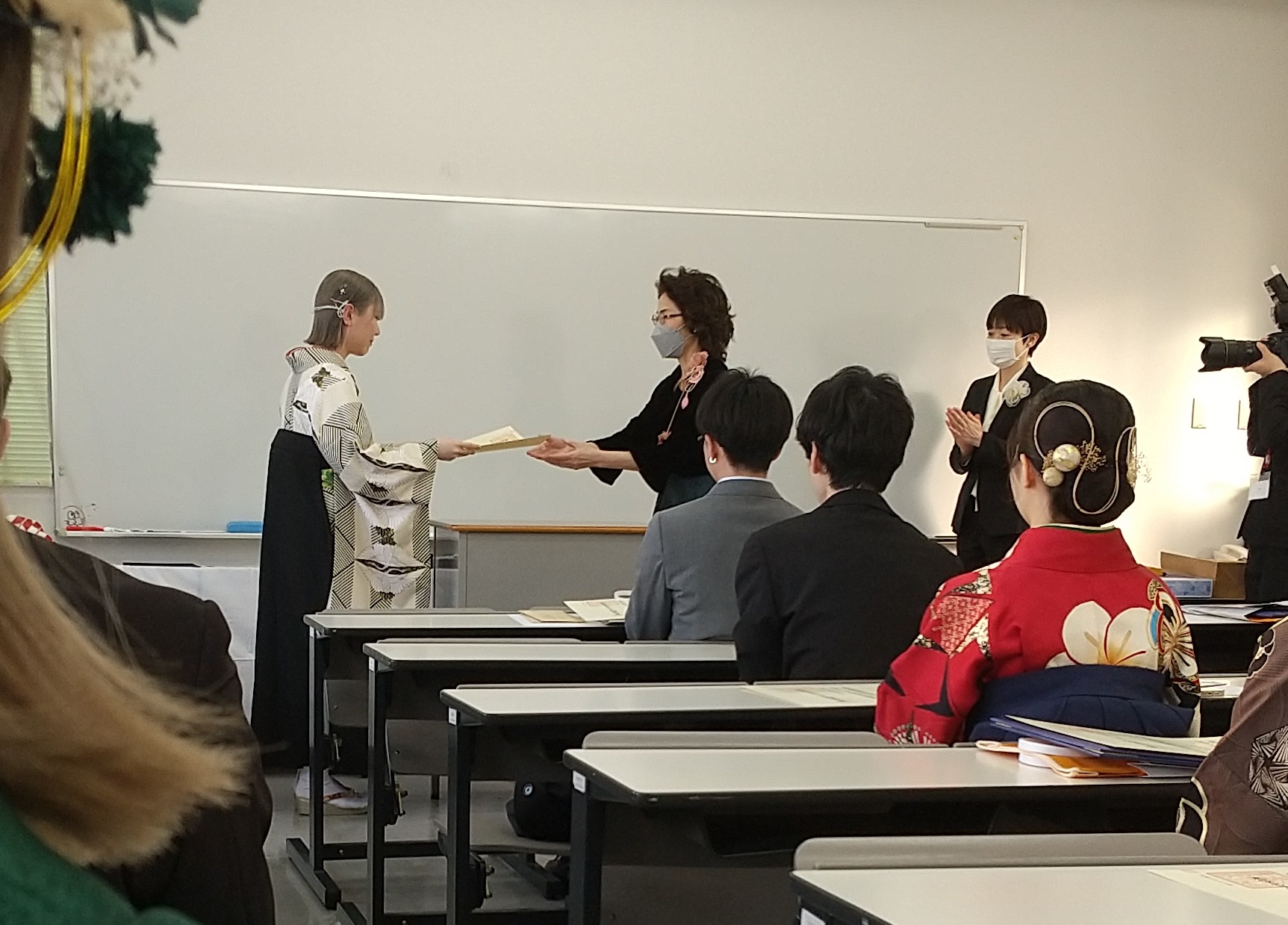 全体での式典終了後は学科専攻別の学位記授与です。司会はこの学年を担当した八鍬講師がつとめました。