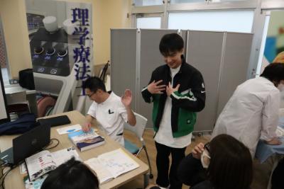これらの体験企画は理学療法学専攻の3年生が主導となり、参加者の皆様にわかりやすくレクチャーしてくれました。