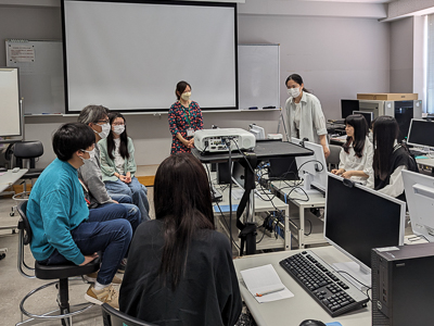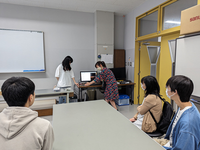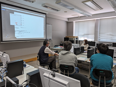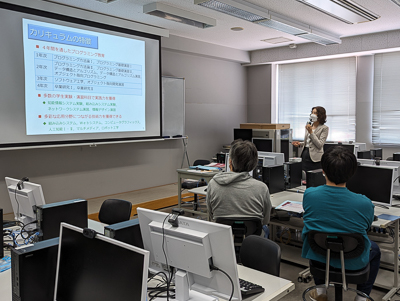知能情報システム学科のプログラムでは、冒頭に沈学科長が学科紹介と各入試方式について説明しました。その後の学科施設見学では、3つの実験室と費准教授の研究室を紹介しました。その中で、プログラミングの授業で学生が作成した簡単なゲームや、センサーを用いたモーター制御、遠隔操作による4輪ロボット制御などのデモンストレーションを行いました。