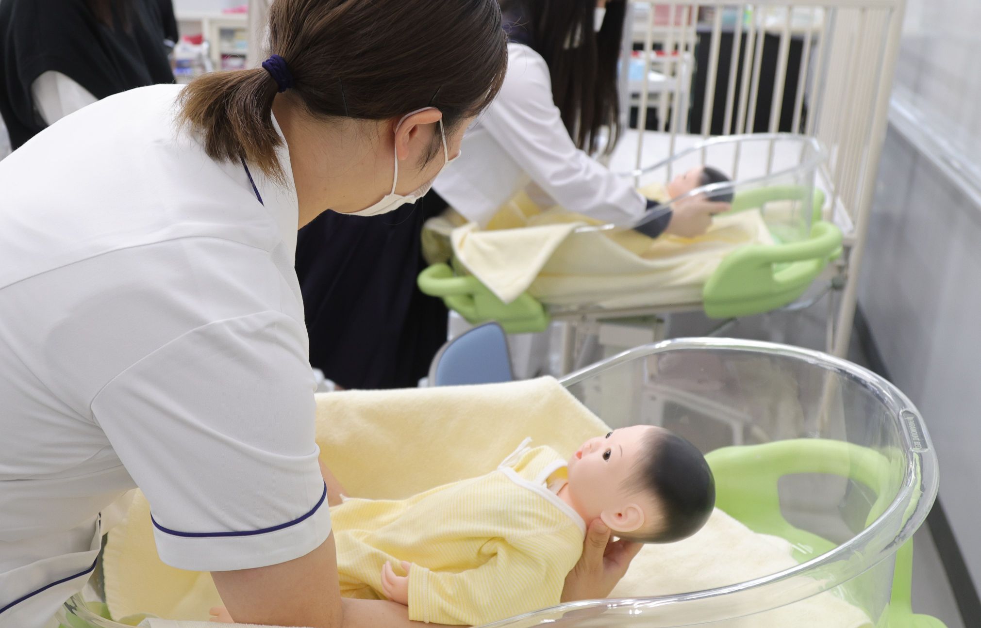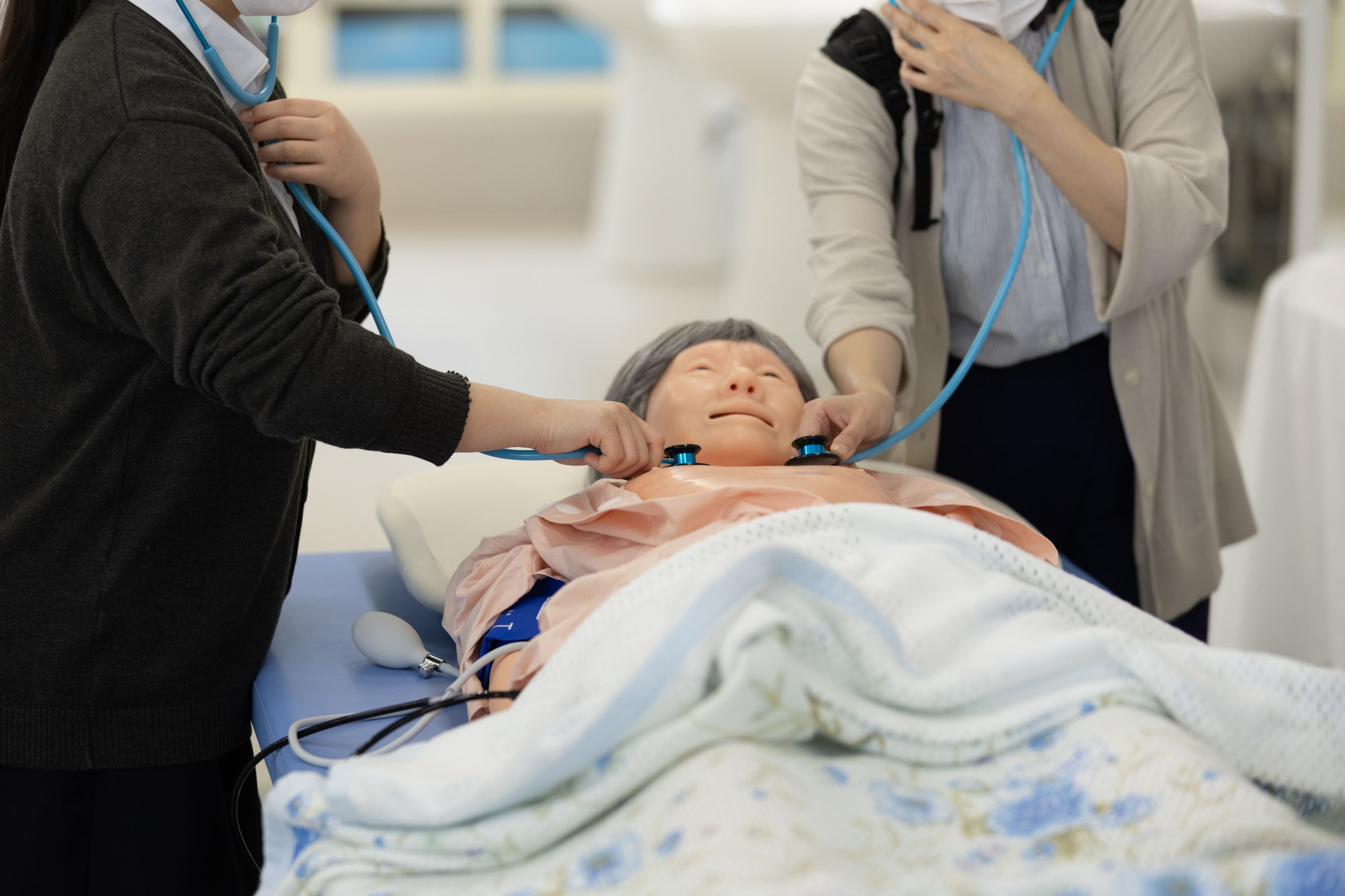 今回は、小児看護学と成人看護学から乳児と成人のシミュレーターを使用したバイタルサイン測定体験、