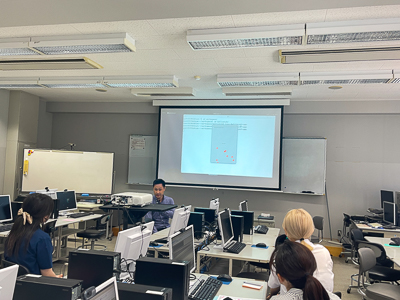 知能情報システム学科のプログラムでは、学科紹介、施設見学、模擬授業等が行われました。今回の模擬授業は、高根教授による「コンピュータで音をつくって聴いてみよう」でした。パソコンを用いて様々な音をつくり、その音を聴くことで人間の音の聴こえの不思議な側面を体験するという内容でした。参加者は音の生成と聴覚の関係に興味津々で、熱心に耳を傾ける姿が印象的でした。