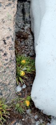 標高4600mの世界は強風、乾燥、低温と登山者にも植物にとって生息しやすい環境とは言えないところにもかかわらず、岩の下でひっそりと咲いている高山植物がとても可憐で愛おしく感じられました。